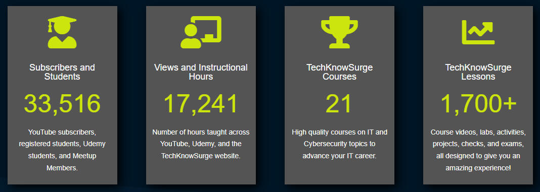 This free email course gives you everything you need to understand me and my partner TechKnowSurge, our consulting services offering of over 200 video training titles and it's importance to you and your company. Plus we provide a unique way to track and scale your security operational processes and department given what people and dollars your business can scale over. We are college educators and this is the key content we teach to students.